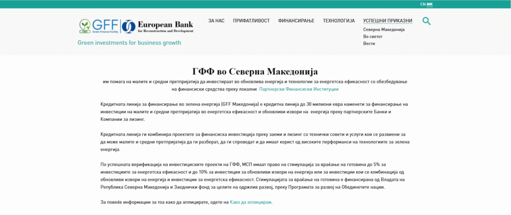 им помага на малите и средни претпријатија да инвестираат во обновлива енергија и технологии за енергетска ефикасност со обезбедување на финансиски средства преку локални Партнерски Финансиски Институции.